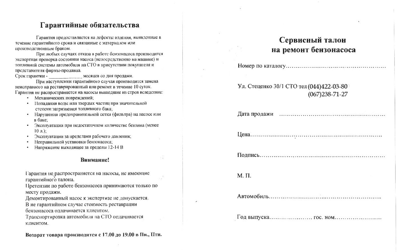 Гарантийные обязательства на ремонт бензонасоса: